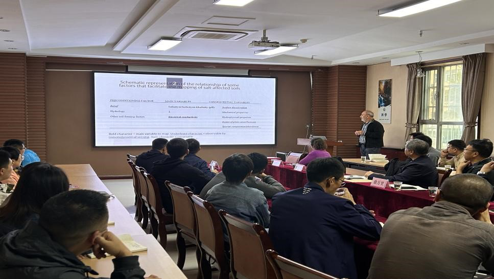 報告會由學會常務理事周宏飛研究員及秘書長買文選共同主持,新疆土壤與肥料學會成員、中科院新疆生地所、新疆農科院土壤肥料和農業(yè)節(jié)水研究所等近120人線上線下參加了報告會。Toth Tibor教授圍繞21世紀土壤鹽漬化評估問題,結合世界各地不同下墊面鹽堿土壤的研究案例,重點介紹了鹽堿土數字制圖方法,指出鹽漬土壤鹽份時空分布圖繪制的難點和今后的方向。報告會后,Tibor教授同參會人員就相關學術問題進行了熱烈互動和深入交流。此次學術交流拓寬了參會人員在鹽漬化領域的研究視野,豐富了研究思路,參會者紛紛表示受益匪淺。報告會后在學會相關人員陪同下參觀了新疆自然博物館,之后赴中科院新疆生地所阜康荒漠生態(tài)國家野外科學觀測研究站、克拉瑪依市鹽土農業(yè)區(qū)和鹽堿地生物改良試驗場進行研討和實地考察。