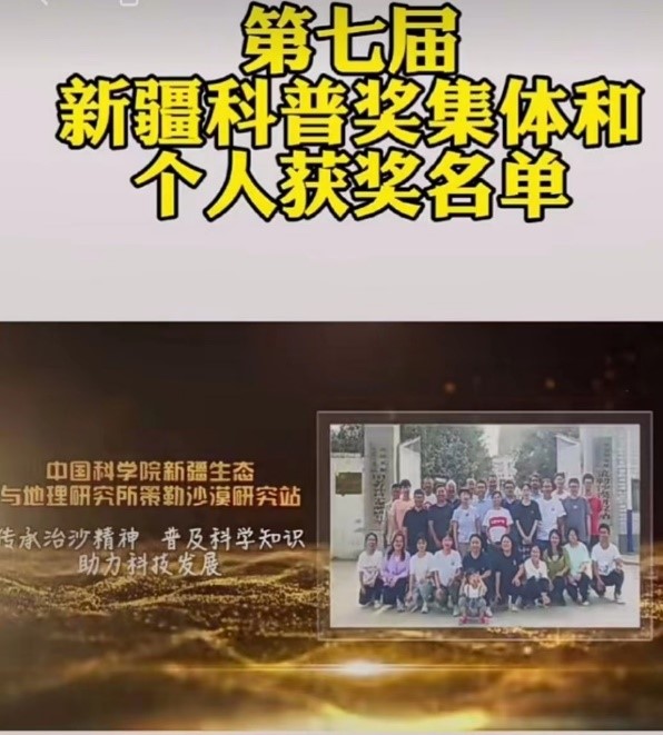 9月18日,2023年全國科普日新疆第七屆新疆科普獎個人和集體獎公布,新疆地理學會推薦的中國科學院新疆生態與地理研究所策勒沙漠研究站(以下簡稱策勒站)榮獲第七屆新疆科普獎集體;新疆地理學會常務理事、烏魯木齊市教育研究中心地理教研員正高級教師祝斌榮獲第七屆新疆科普獎個人。
