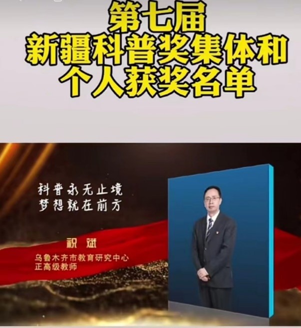 榮獲科普獎個人的祝斌老師,烏魯木齊市教育研究中心中學地理教研員,中學正高級教師,新疆師范大學地理科學與旅游學院碩士生導師,新疆地理學科教學研究會常務理事兼副秘書長,新疆地理學會常務理事,新疆天文學會常務理事,烏魯木齊市中學地理教學研究會副理事長兼秘書長,自治區和烏魯木齊市“國培計劃”、“繼續教育”授課專家,紅山教育高中地理名師工作室主持人,烏魯木齊地區高三年級模擬考試地理學科命題組組長。多年從事中學地理課堂教學、教育研究、考試研究工作,在省級以上期刊上發表論文20余篇,主持或參與多項自治區級課題研究工作,負責組織和編寫30余冊教輔資料供全疆師生使用,曾獲自治區第二屆青年教師地理教學能手大賽一等獎、首屆自治區優秀中學地理教育工作者、第九屆全國優秀中學地理教育工作者、自治區教育廳“送教下基層”活動專家組優秀成員稱號,連續多年參加自治區高考地理試卷統一閱卷工作和負責自治區高中學業水平考試地理試卷的統一閱卷工作,積累了較為豐富的高考復習備考經驗。