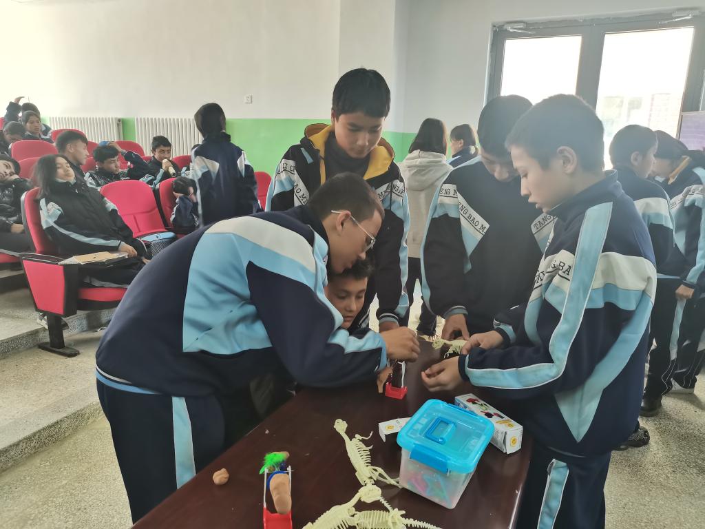 中國科學院新疆生態與地理研究新疆自然博物館副館長、新疆科學探險協會理事長王虎紋與新疆自然博物館科普工作人員于源博做《漫游恐龍的故鄉》、《遠古的寶藏-化石》等系列科普課程,圍繞“侏羅紀時代的恐龍”開展實踐,帶領學生重返恐龍時代,跟隨“古生物科學家”的腳步,重新從化石中發現、研究、復原恐龍,深入探索新疆恐龍的“前世今生”??茖W課題上,同學們興致勃勃,不僅聽到了一場有趣而生動的科學課程演示,也通過團隊協作動手實踐了恐龍骨骼搭建、體會行走動力平衡的原理,通過模擬古生物學家的工作過程,更深入地了解恐龍及其時代的特點,同時也提高了他們的科學素養和學習古生物學的探究方法。