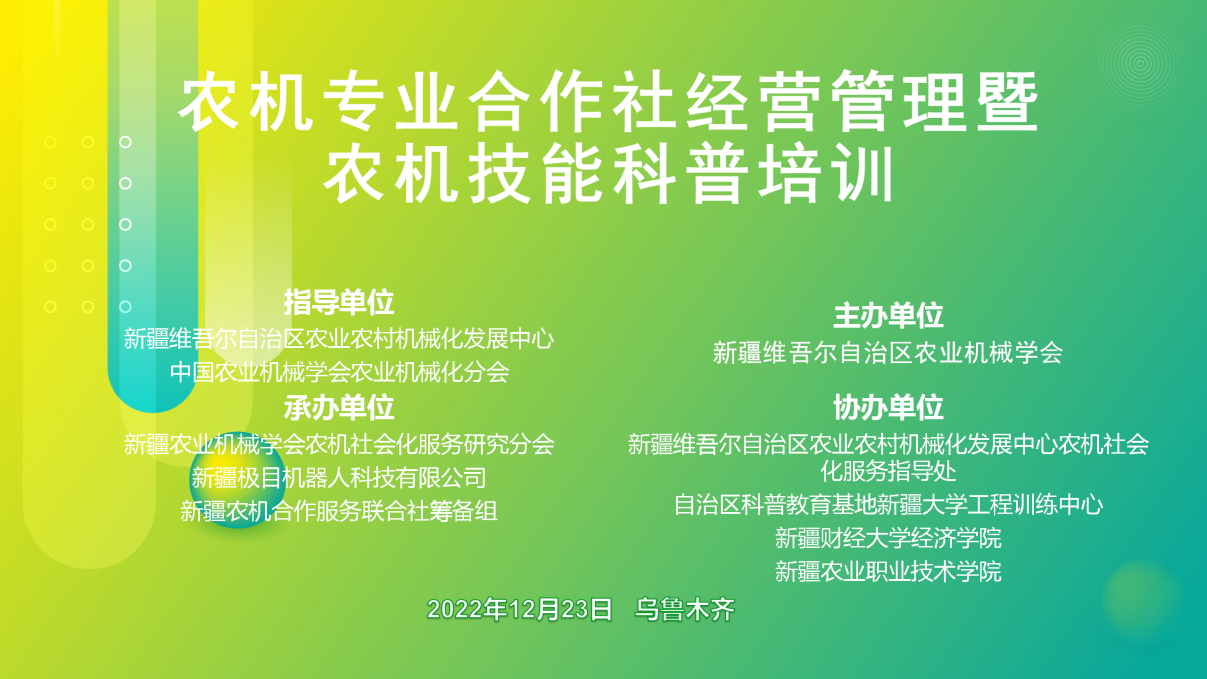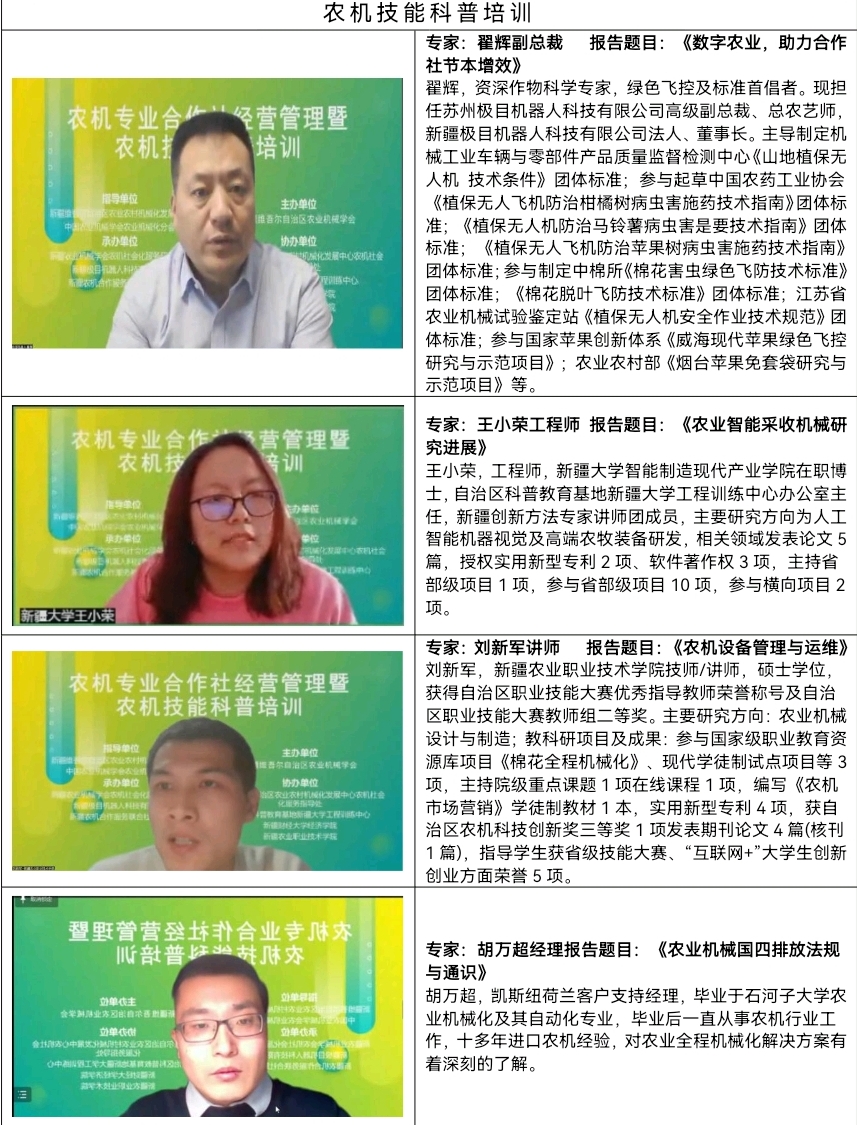 圍繞大會“農機專業合作社經營管理暨農機技能科普培訓”的主題,培訓設置了農機專業合作社經營管理專場和農機技能科普培訓專場。農機專業合作社經營管理專場由中國農業大學中國農業機械化發展研究中心楊敏麗教授,新疆維吾爾自治區農業機械學會監事會主席歐興江,新疆財經大學經濟學院郭艷芹副教授圍分別就“我國農機社會化服務高質量發展與數字化趨勢”“加快農機專業合作社發展,全提升農機社會化服務水平”“合作社規范化經營與管理”進行授課。農機技能科普培訓專場由蘇州極目機器人科技有限公司高級副總裁、總農藝師,新疆極目機器人科技有限公司法人、董事長翟輝,自治區科普教育基地新疆大學工程訓練中心辦公室主任王小榮,新疆農業職業技術學院劉新軍,凱斯紐荷蘭客戶經理胡萬超分別就“數字農業,助力合作社節本增效”“農業智能采收機械研究進展”“農機設備管理與運維”“農業機械國四排放法規與通識”等相關內容授課。