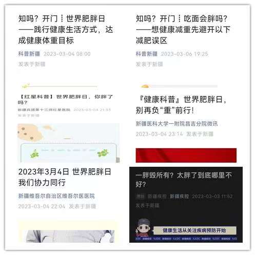 借助多媒體平臺(tái),發(fā)揮專家優(yōu)勢(shì)加大對(duì)活動(dòng)的宣傳力度,通過新疆科協(xié)官網(wǎng)等公眾平臺(tái)宣傳世界肥胖日活動(dòng)主題海報(bào)、世界肥胖日中國(guó)主題宣傳片等系列肥胖防控科普知識(shí)。組織專家、會(huì)員、注冊(cè)營(yíng)養(yǎng)師圍繞主題撰寫制作科普文章、科普短視頻等。通過科普新疆平臺(tái)發(fā)布原創(chuàng)科普文章2篇,通過新醫(yī)微訊、新疆疾控等10余個(gè)公眾平臺(tái)進(jìn)行專題宣傳,共發(fā)布科普專欄文章10多篇。
