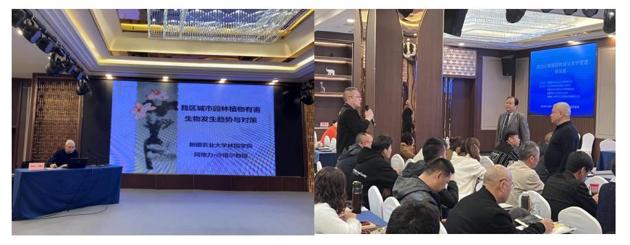 新疆農業大學林學與風景園林學院阿地力?沙塔爾教授結合30多年從事病蟲害防治經驗,從園林植物病蟲害的特點、我區園林植物有害生物發生趨勢、影響主要園林病蟲害種類演替的原因及防治對策等四個方面對學員進行了培訓和學員互動交流。