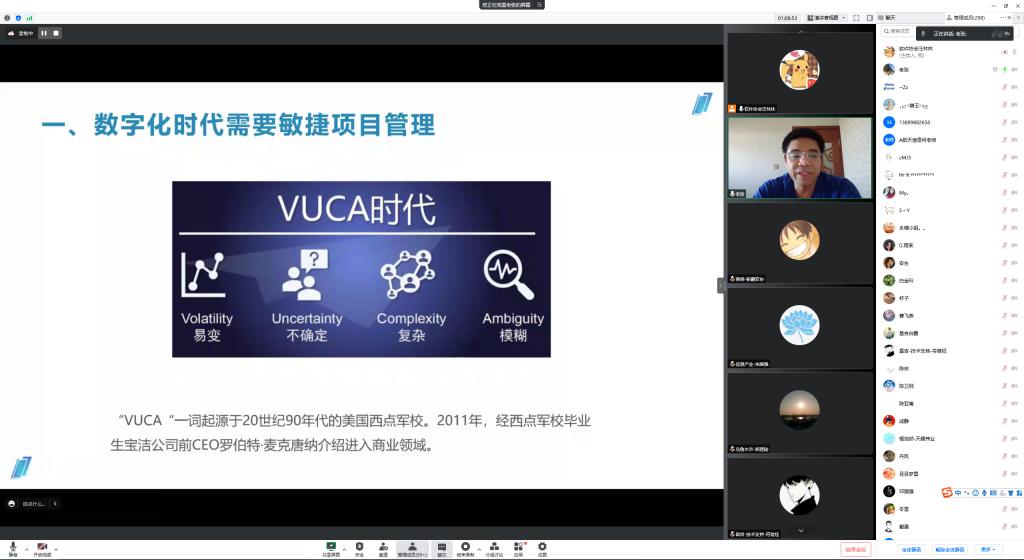 張斌老師主要從數(shù)字化時(shí)代需要敏捷項(xiàng)目管理、敏捷項(xiàng)目管理的深層背景、Scrum流程管理介紹以及現(xiàn)代項(xiàng)目管理的發(fā)展趨勢(shì)這四方面內(nèi)容作了深入的講解和案例分享。他認(rèn)為,當(dāng)下是一個(gè)VUCA時(shí)代,每家企業(yè)都要面對(duì)一個(gè)快速變化、高度復(fù)雜的外部環(huán)境。在互聯(lián)網(wǎng)、科技新興行業(yè),敏捷大行其道,越來越多的企業(yè)通過敏捷提升了組織快速響應(yīng)能力、快速應(yīng)變能力和持續(xù)創(chuàng)新能力。然而,當(dāng)項(xiàng)目管理那點(diǎn)事遇到敏捷那點(diǎn)事,我們應(yīng)該如何應(yīng)對(duì)?避免受到新興前沿技術(shù)的沖擊,敏捷創(chuàng)新能力管理至關(guān)重要。
