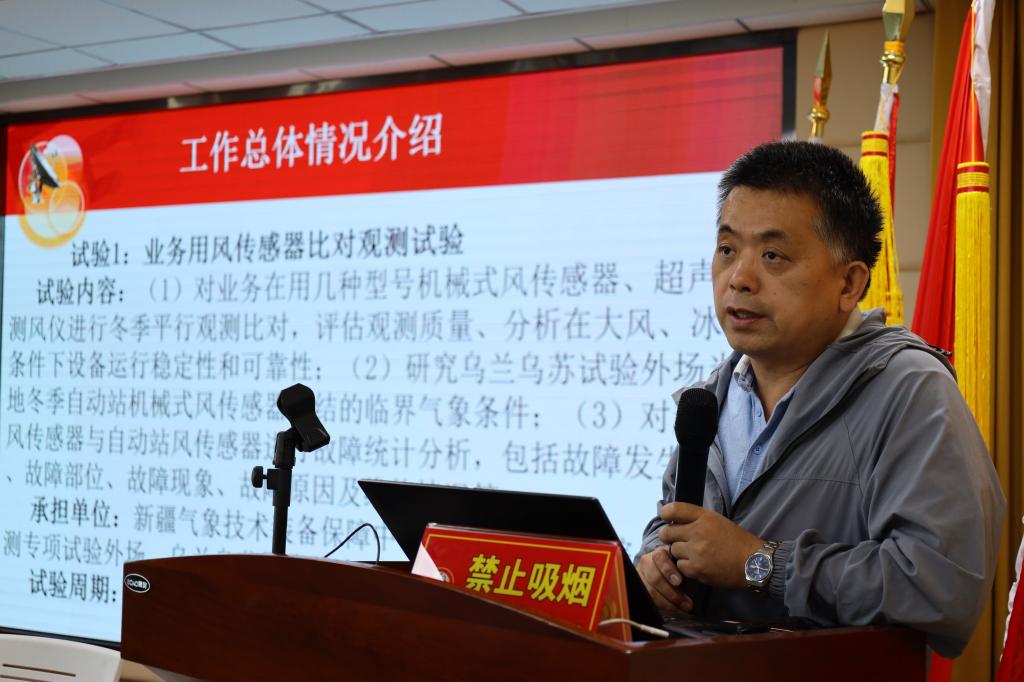 新疆氣象技術(shù)裝備保障中心、高級(jí)工程師彭堅(jiān)作《新疆國(guó)家級(jí)綜合氣象觀測(cè)試驗(yàn)(基地)外場(chǎng)情況介紹》的報(bào)告。