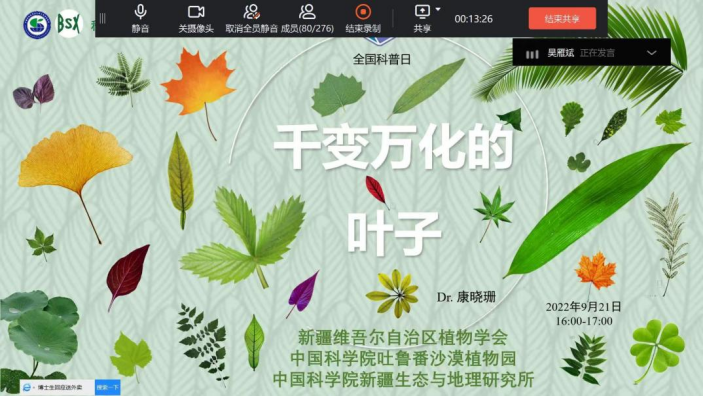 為廣泛宣傳“喜迎二十大 科普向未來”科普活動主題,向公眾傳播植物科學知識,觀察身邊的自然,結合秋季植物葉子顏色、生存狀態變化的自然景象。9月21日,新疆植物學會康曉珊博士精心組織開展了《千變萬化的葉子》科普講座活動,帶著同學們通過認識葉子的結構,了解葉子形態變化的功能和顏色豐富的原因,旨在引導中小學生關注自然,熱愛自然,欣賞自然。