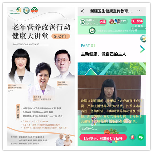 6月28日,2024中國老年醫學學會大型公益活動暨老年營養改善行動走進新疆醫科大學老年活動中心,開展營養與食品安全《健康大講堂》活動,本次活動由中國老年醫學學會營養與食品安全分會主辦,新疆營養學會和新疆醫科大學第一附屬醫院承辦,活動采取線上線下相結合的方式,線下吸引了院內200多位離退休人員參與,線上共計18.3萬人次通過快手直播-新疆衛生健康宣傳教育官方平臺觀看直播。