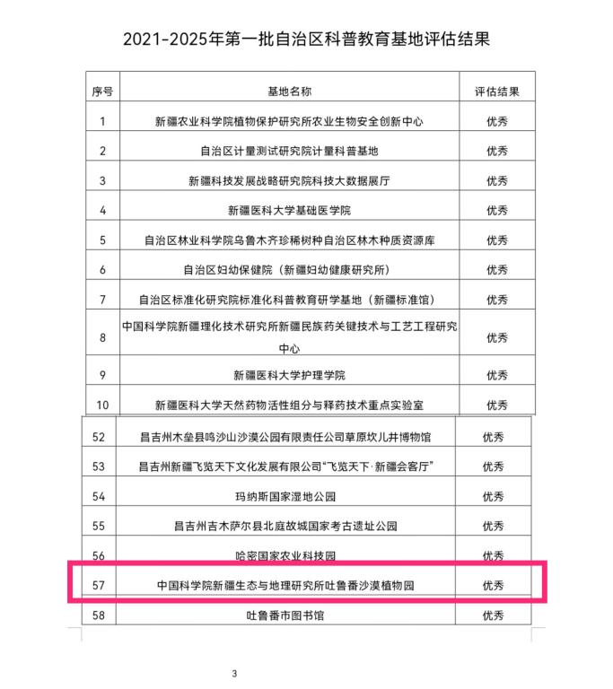 根據(jù)《自治區(qū)科普教育基地認(rèn)定與管理辦法》(2022年修訂),自治區(qū)科協(xié)組織開展了2021-2025年第一批自治區(qū)科普教育基地評(píng)估工作。經(jīng)各自治區(qū)科普教育基地自評(píng)、各評(píng)估工作組綜合評(píng)議、自治區(qū)科協(xié)黨組會(huì)議審議,擬評(píng)定中國科學(xué)院新疆生態(tài)與地理研究所吐魯番沙漠植物園等80個(gè)自治區(qū)科普教育基地為優(yōu)秀等級(jí),其余通過評(píng)估的66個(gè)自治區(qū)科普教育基地評(píng)定為合格等級(jí)。