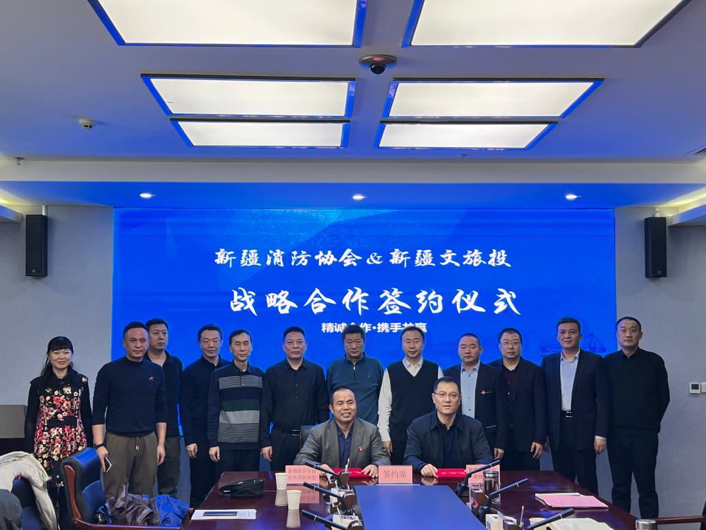新疆安全技術防范行業協會秘書長呂遠彩、新疆文化旅游投資集團有限公司總工程師馮俊、新疆新旅建設工程管理有限公司副董事長周建軍、新疆旅投金谷大酒店有限公司總經理楊汝偉,新疆消防協會常務理事文毅、楊志遠及新疆消防協會專家李東、李守斌、朱筱豐、張乃霖、王鵬等參加簽約儀式。