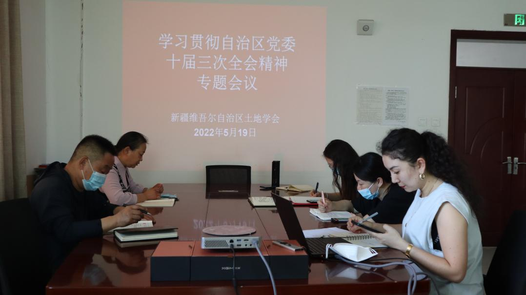 5月14日至15日,中國(guó)共產(chǎn)黨新疆維吾爾自治區(qū)第十屆委員會(huì)第三次全體會(huì)議在烏魯木齊召開(kāi)。5月19日上午,新疆土地學(xué)會(huì)黨支部組織學(xué)習(xí)貫徹自治區(qū)黨委十屆三次全會(huì)精神,學(xué)會(huì)全體工作人員對(duì)全會(huì)精神進(jìn)行了認(rèn)真學(xué)習(xí)。
