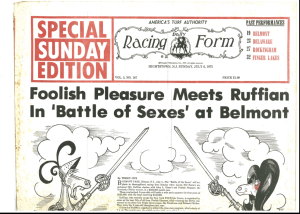 貝蒙 5.5F 作為“暴徒”職業生涯中的首場比賽,它就給大家展現出驚人的實力。在這場比賽中“暴徒”狂勝15個馬位,取得壓倒性的勝利,在之后的比賽中更是10戰10勝。這10場連勝中,既包括1100米的短途,又包括2400米的中長途,而且平均每場都贏接近九個馬位,同時多次刷新當時賽場的最佳記錄,這對于任何時代的任何馬來說,都是無可挑剔和令人羨慕的簡歷當時美國女權解放運動正在興起,輿論借機策劃了“暴徒”和公馬之間的“性別大戰”,最后只有當年肯塔基德比冠軍“愚者之樂”(Foolish Pleasure)勉強應戰。據說,“暴徒”的教練Frank Whiteley Jr.原本是不贊成暴徒參加這場比賽的,但是由于受歡迎程度、炒作和認為“暴徒”無論如何都會贏,他最終同意了。