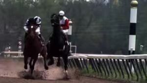 巧合的是,“暴徒”和“愚者之樂”的御用騎師都是JacintoVasquez,面對抉擇,Jacinto毫不猶豫選擇策騎“暴徒”,因此“愚者之樂”不得不另請騎手。對決早段,“暴徒”處于領先位置,然而就在跑過600米處時,意外發生了!賽場上幾只飛鳥的突然出現使得“暴徒”受到了驚嚇,隨之而來的是兩名騎師都能聽到的骨頭碎裂聲——“暴徒”的右前腳骨折。騎師當時想勒停它結束比賽,但強烈的斗心驅使著這匹不敗的女漢子繼續奔跑,它不顧騎師的指令,直到騎師躍下馬背,“暴徒的速度才開始減慢。