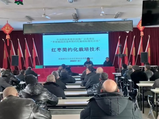 2023年2月8日至15日,新疆林學會選派2位林果專家,前往和田地區墨玉縣、和田市、和田縣、策勒縣舉辦了7場紅棗簡約化栽培技術培訓,累計培訓果農和生態護林員1000余人。