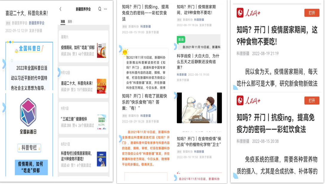 2022年全國科普日期間,新疆營養學會以《中國居民膳食指南(2022版)》核心準則為主題,結合新冠肺炎疫情防控期間居民膳食營養知識需求,積極組織專家、理事、會員、志愿者利用工作之便和業余時間,參與全國科普日新疆系列主題宣傳活動,深入開展了多場內容豐富、形式多樣的線上線下科普活動。
