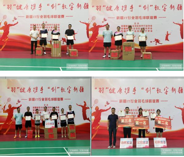閉幕式由新疆“IT三會”副秘書長劉靚主持,分別邀請烏魯木齊天耀偉業信息技術服務有限公司董事長雷耀軍、新疆時空信息技術有限公司總經理張新國、新疆億網科技有限責任公司總經理李毅三位副理事長單位代表作為頒獎嘉賓為男子單打、女子單打、混合雙打獲獎者頒獎。秘書長吳鵬為團體賽獲獎代表隊頒發了協會/學會精心準備的團體獎項。