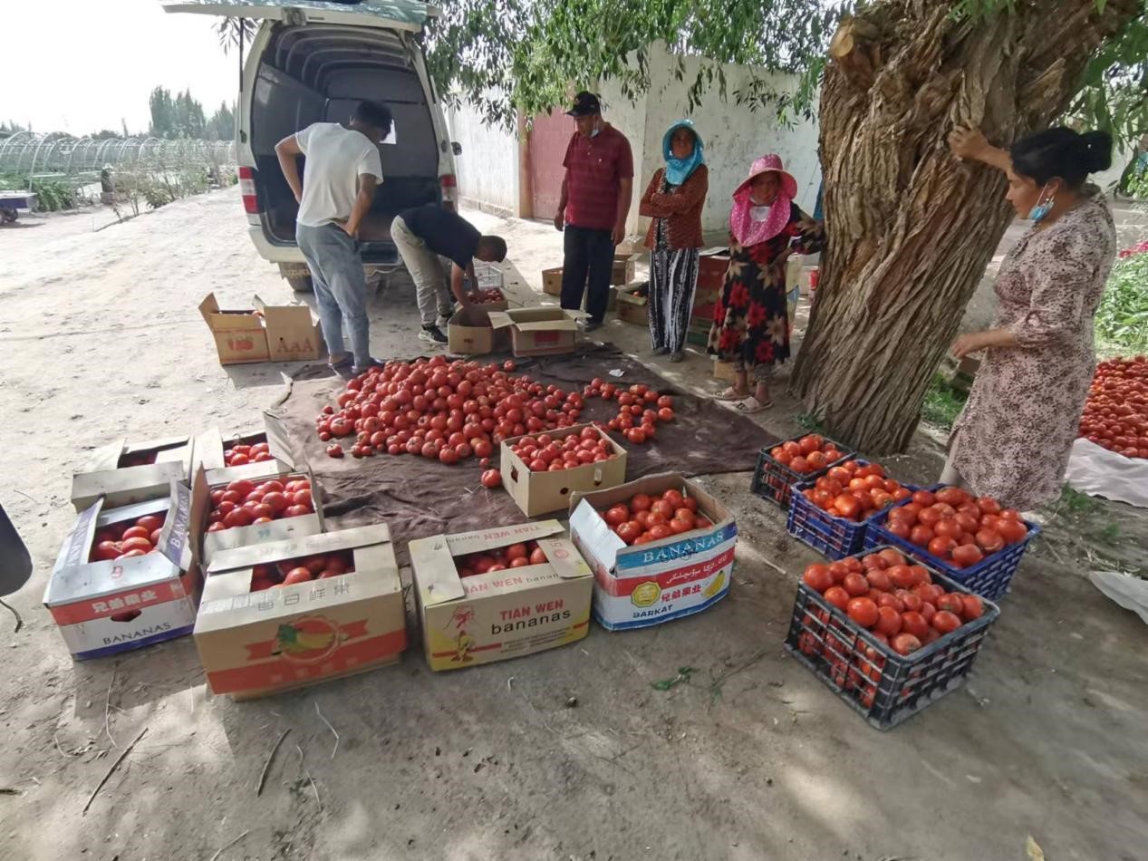 在喀熱喀什村種植大棚內(nèi),生機(jī)盎然,一串串粉紅色小西紅柿掛滿(mǎn)了枝頭,棚內(nèi)25多位當(dāng)?shù)剞r(nóng)民在采摘成熟的西紅柿,并裝箱子,準(zhǔn)備出欄,他們臉上洋溢著豐收的喜悅!