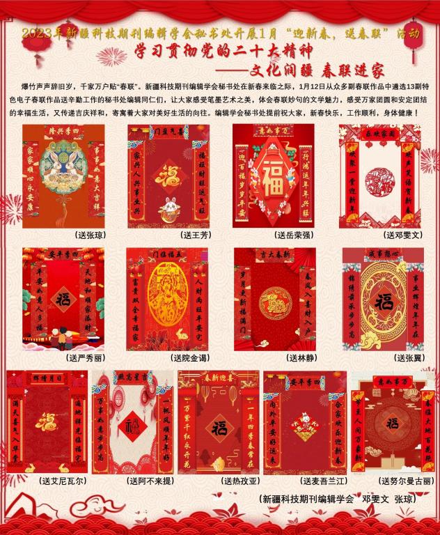 1月12日,新疆科技期刊編輯學(xué)會(huì)秘書(shū)處從多副春聯(lián)作品中遴選13副特色電子春聯(lián)作品送給辛勤工作的秘書(shū)處同仁,讓大家感受筆墨藝術(shù)之美,體會(huì)春聯(lián)妙句的文學(xué)魅力,感受萬(wàn)家團(tuán)圓和安定團(tuán)結(jié)的幸福生活。