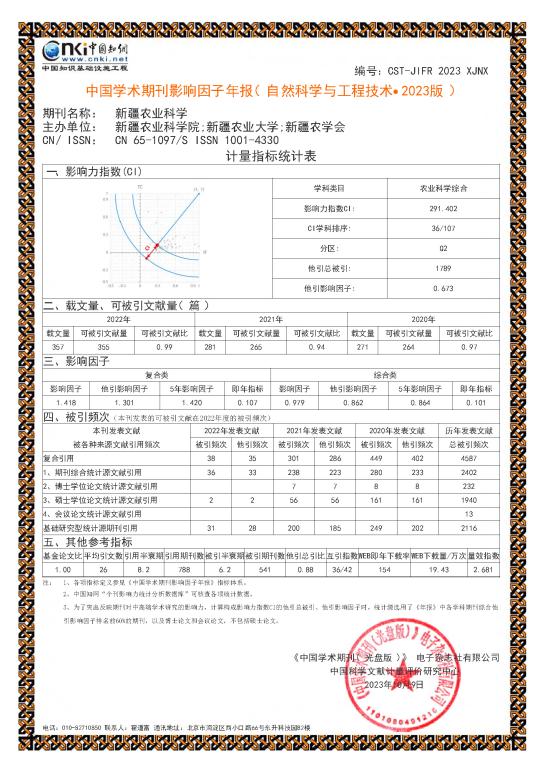據中國知網最新發布的《中國學術期刊影響因子年報(自然科學與工程技術·2023版)》,《新疆農業科學》復合影響因子為1.418,與2022版的1.368相比增長3.6%,WEB下載量19.43萬次,實現影響因子連續顯著增長。期刊影響力指數(CI)291.402,較2022年增加30.245,排名上升了3位,在農業綜合類學科107種期刊中排名36,位居Q2區。此外,期刊的綜合影響因子、總被引頻次、WEB下載量、他引頻次、基金論文比等各項指標均有顯著提升。