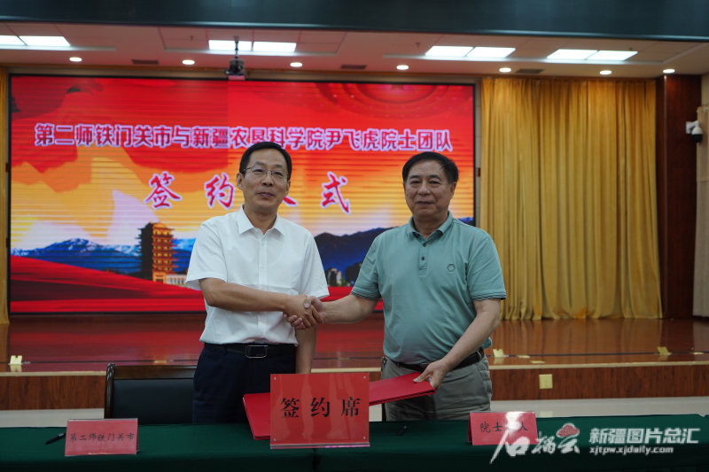 7月15日,尹飛虎院士團隊與第二師鐵門關(guān)市政府簽訂鹽堿地治理科技合作框架協(xié)議。 石榴云/新疆日報記者 王昕攝