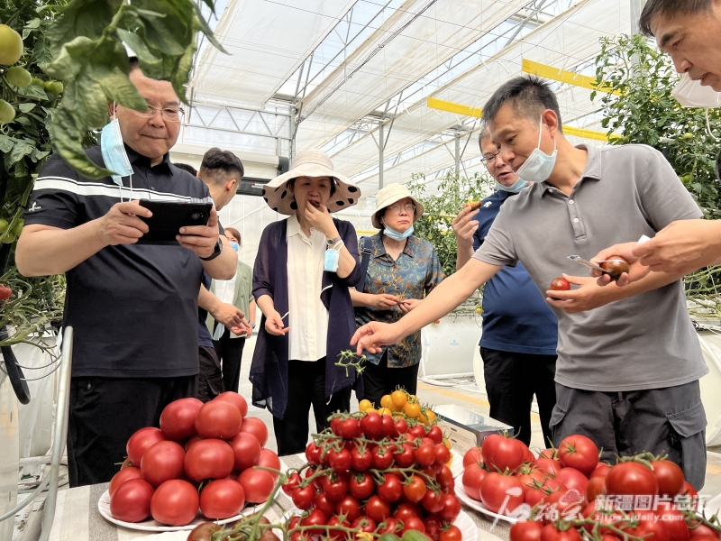7月13日,院士、專家們在霍爾果斯現(xiàn)代農(nóng)業(yè)科技產(chǎn)業(yè)園品嘗番茄。石榴云/新疆日報記者 仲兆豐攝