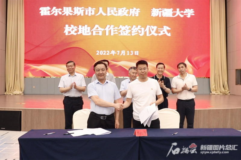 7月13日,霍爾果斯市人民政府和新疆大學(xué)簽訂了校地合作協(xié)議。石榴云/新疆日報記者 仲兆豐攝