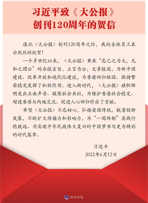 習近平在賀信中指出,一個多世紀以來,《大公報》秉承“忘己之為大,無私之謂公”的辦報宗旨,立言為公,文章報國,為新中國建設、改革開放和現代化建設,為香港回歸祖國、保持繁榮穩定發揮了積極作用。進入新時代,《大公報》旗幟鮮明發出正面聲音、凝聚社會共識,為維護香港社會穩定、增進香港與內地交流、促進人心回歸作出了貢獻。