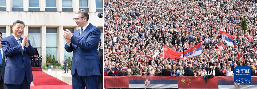 當地時間5月8日上午,國家主席習近平在貝爾格萊德塞爾維亞大廈同塞爾維亞總統武契奇舉行會談。會談前,武契奇陪同習近平來到政府大廈平臺(左圖)。大廈廣場上,一萬五千名塞爾維亞民眾揮舞中塞兩國國旗,對習近平表示最熱烈的歡迎(右圖)。(拼版照片) 新華社記者 黃敬文 丁海濤 攝