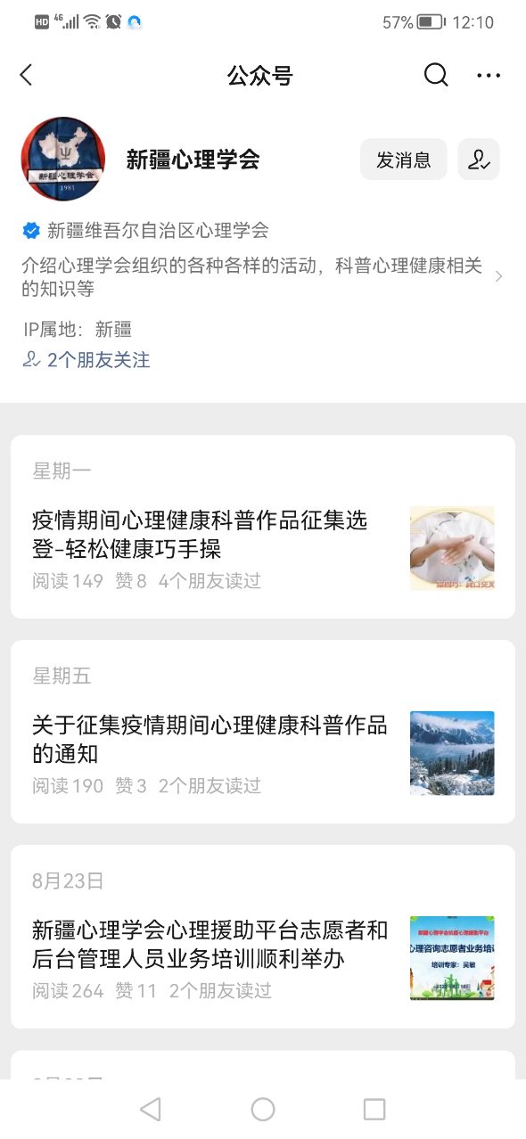 自本輪疫情發生以來,新疆心理學會積極發揮心理學工作者的專業優勢,及時與中國心理學會新疆心理督導點取得聯系,迅速組織起30余人的心理援助志愿者服務隊伍,通過多種途徑,為我區群眾及時提供科學有效的公益心理疏導服務,取得了良好的效果,受到廣泛好評。