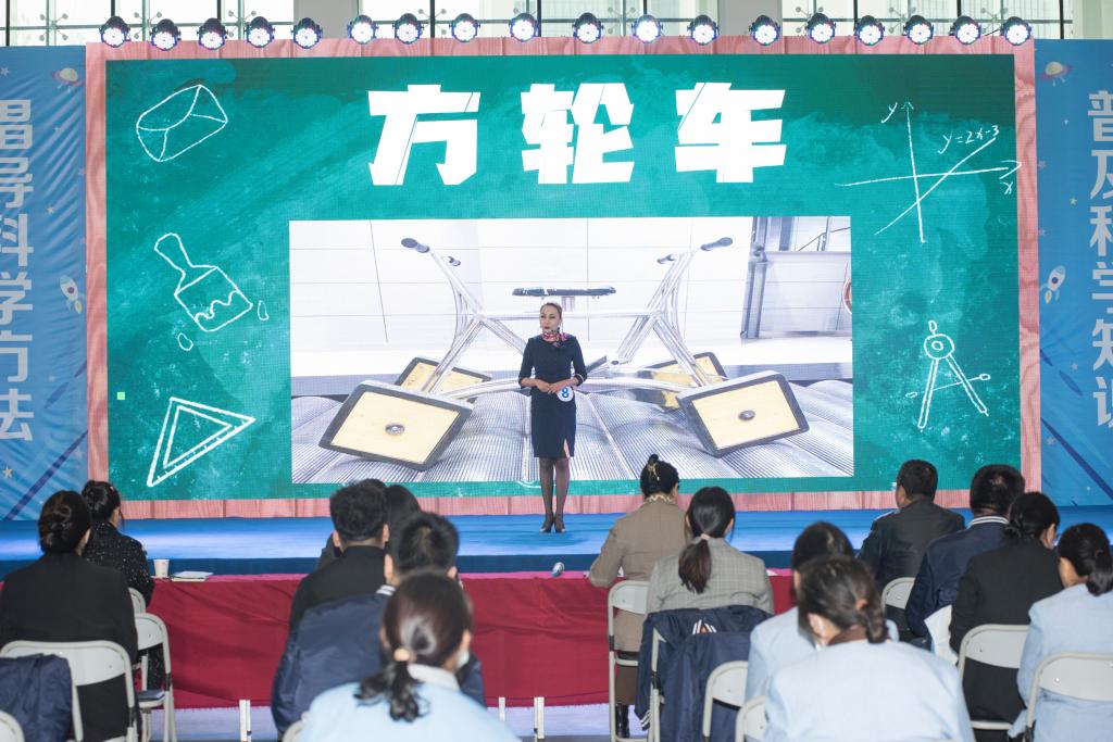 “各位同學們大家好,歡迎大家來到科技館參觀。開始參觀之前,我想問大家一個問題,我們日常所見到的交通工具都有哪些?請這位穿紅衣服的小朋友回答。嗯,她說的很對,有汽車、自行車、摩托車.......這些交通工具的車輪都是圓形的。那么,有沒有方形的車輪呢?它又是怎么運動的呢?”這是八號參賽選手熱西旦·亞森江在單件展品輔導比賽環節的精彩一幕。