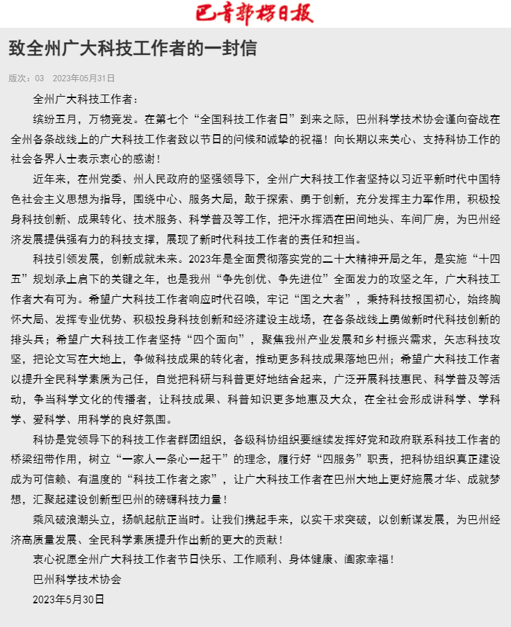 巴州科協發布“致全州廣大科技工作者的一封信”
