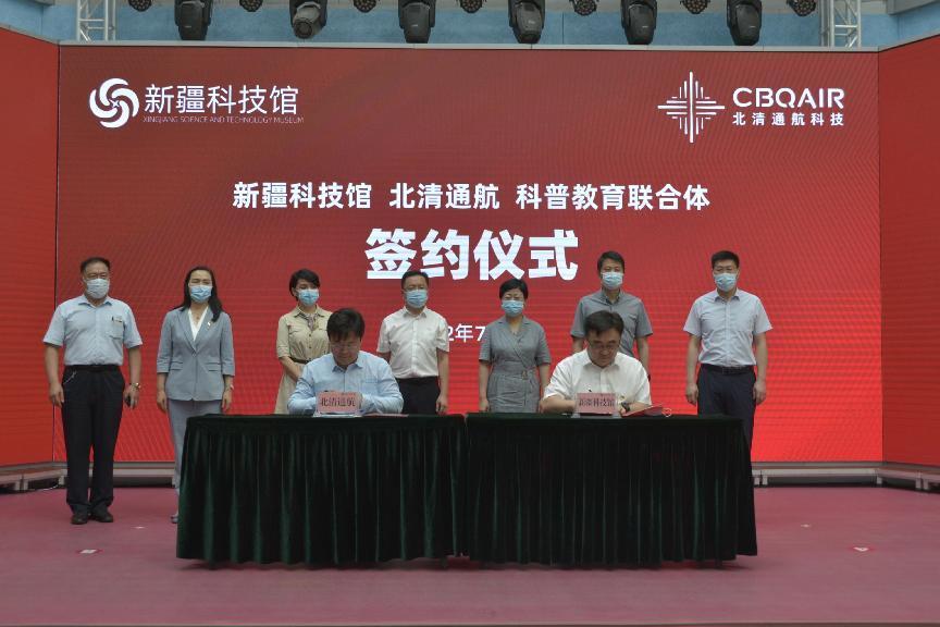 隨后,新疆科技館館長趙輝與北清通航科技(烏魯木齊)有限公司董事長諸偉簽署了合作框架協議,簽約嘉賓進行了助簽并合影留念。