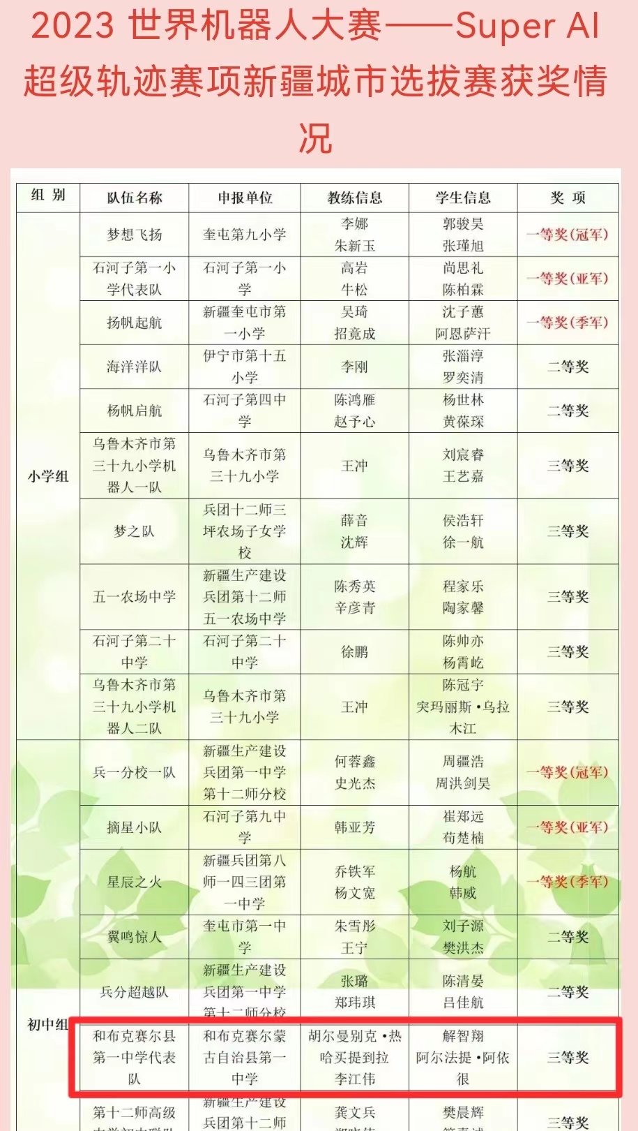 2023年11月4日,由中國電子協(xié)會主辦的世界機器人大賽——Super AI超級軌跡賽項新疆城市選拔賽在烏魯木齊市奧林匹克中心成功舉辦。塔城地區(qū)和布克賽爾縣第一中學代表隊在比賽中取得了優(yōu)異成績。由胡爾曼別克·熱哈買提到拉、李江偉指導的八年級9班解智翔同學、八年級2班阿爾法提·阿依很同學榮獲初中組三等獎。