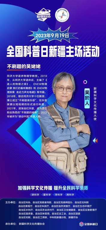 “新疆的朋友,大家好!我對(duì)新疆很有感情,我覺(jué)得任何語(yǔ)言在新疆的美景面前都會(huì)變得蒼白無(wú)力,我向往和新疆的朋友們?cè)倬邸_@次全國(guó)科普日新疆活動(dòng),希望大家一起宣傳推廣和做好新疆科學(xué)文化傳播工作,也希望更多的朋友加入到科普事業(yè)中來(lái),讓我們一起用科學(xué)認(rèn)知世界,定義未來(lái)!”