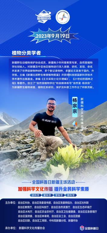 想看最攢勁的植物科普,就在2023年9月19日全國科普日新疆主場活動現場!新疆科學文化傳播大使、網絡科普達人楊宗宗將與觀眾分享他在新疆植物保護和科普方面的收獲和成果,敬請期待!