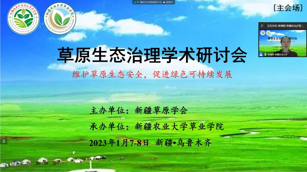 2023 年 1 月 7-8 日,由新疆草原學(xué)會(huì)主辦,新疆農(nóng)業(yè)大學(xué)草業(yè)學(xué)院承辦的草原生態(tài)治理學(xué)術(shù)研討會(huì)在線上召開。自治區(qū)科協(xié)黨組成員、副主席張煜,新疆草原學(xué)會(huì)副理事長(zhǎng)、新疆農(nóng)業(yè)大學(xué)草業(yè)學(xué)院院長(zhǎng)張博,自治區(qū)林草局處長(zhǎng)閆凱出席論壇并講話。