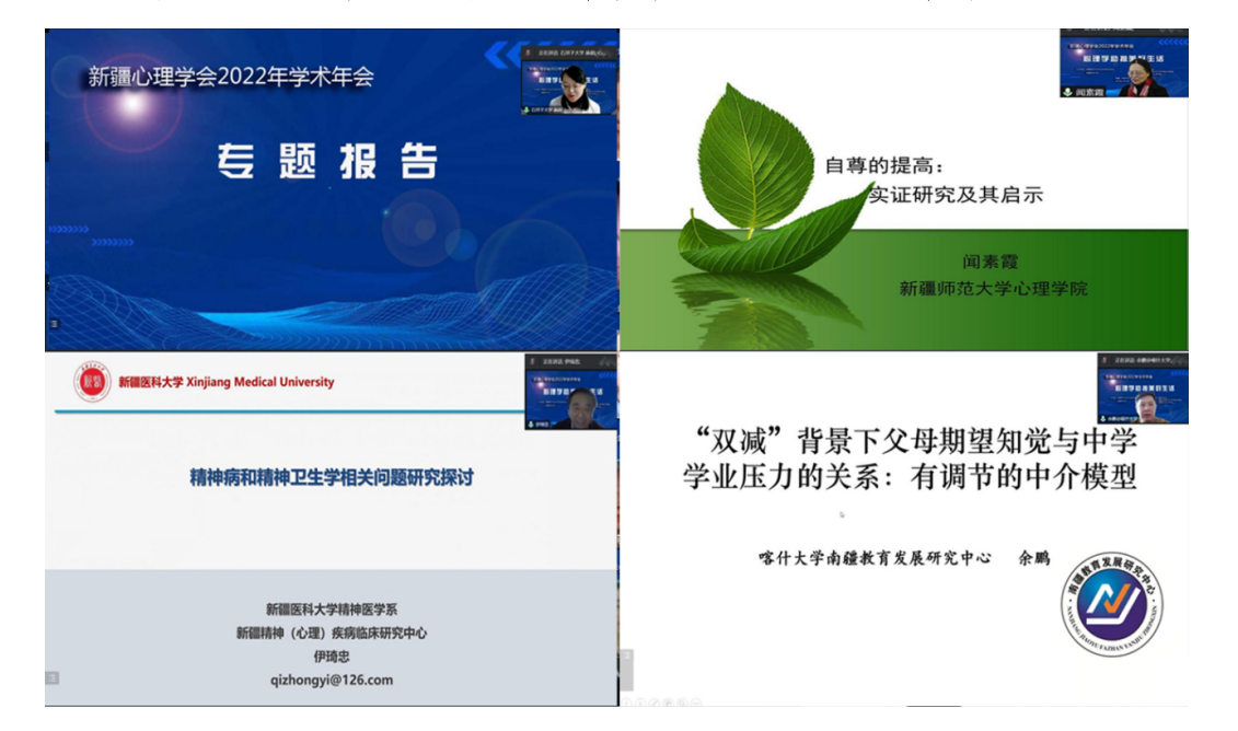專題報告環(huán)節(jié),來自新疆師范大學心理學院聞素霞教授,新疆醫(yī)科大學第一附屬醫(yī)院伊琪忠主任,喀什大學南疆教育發(fā)展研究中心主任、教育科學學院副院長余鵬教授分別作題為《自尊的提高:實證研究及其啟示》《精神病和精神衛(wèi)生學相關問題研究探討》《“雙減”背景下父母期望知覺與中學生學業(yè)壓力的關系:有調(diào)節(jié)的中介模型》的報告。聞素霞教授通過分享三個實證研究,探究不同自尊者的特質(zhì)及對提高自尊的啟示;伊琪忠主任從精神病與精神衛(wèi)生問題的現(xiàn)狀、精神疾病的病因學研究現(xiàn)狀與心理學工作三個方面展開,著重探討了心理學和精神衛(wèi)生學的合作發(fā)展問題;余鵬教授從選題思考出發(fā)進行分享,基于發(fā)展情景理論,納入教師期望知覺、自主調(diào)節(jié)學習變量,探究父母期望知覺對中學生學業(yè)壓力的影響。