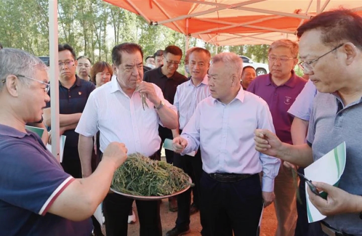 7月16日, 院士、專家在市農(nóng)業(yè)開發(fā)區(qū)查看綠成公司棉田配種的鹽蒿。克拉瑪依日?qǐng)?bào)全媒體記者 努爾買買提·艾山 攝