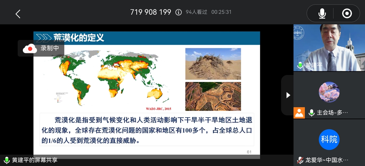 主旨報(bào)告環(huán)節(jié),中國(guó)科學(xué)院院士、蘭州大學(xué)教授黃建平,中國(guó)科學(xué)院院士、中科院新疆分院院長(zhǎng)肖文交等分別圍繞“干旱區(qū)氣候變化”和“天山地貌格局演化”議題作了精彩報(bào)告。特邀報(bào)告環(huán)節(jié),邀請(qǐng)到了西北大學(xué)張世強(qiáng)教授、中科院空天信息創(chuàng)新研究院邱玉寶研究員、中國(guó)水利水電科學(xué)研究院龍愛華研究員及北京大學(xué)邱國(guó)玉教授等分別作了題為“寒區(qū)流域混合產(chǎn)流機(jī)制對(duì)比試驗(yàn)研究”、“雪冰數(shù)據(jù)產(chǎn)品及信息服務(wù)”、“西北內(nèi)陸區(qū)‘自然-社會(huì)-貿(mào)易’水循環(huán)理論方法及應(yīng)用探索”、“大數(shù)據(jù)和人工智能時(shí)代荒漠植被調(diào)查的再思考與新嘗試”的學(xué)術(shù)報(bào)告。