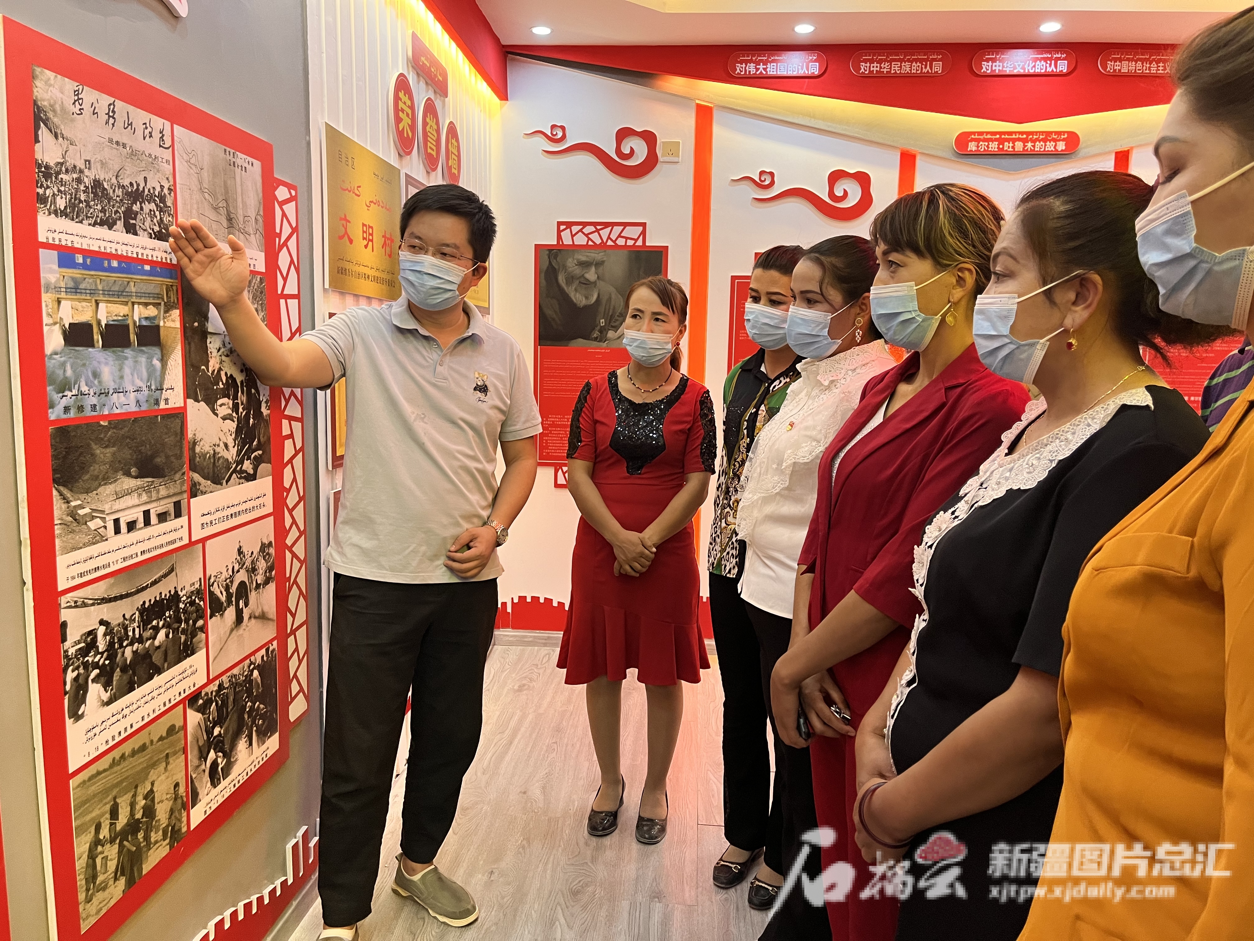10月1日, 盛凱在民豐縣安迪爾鄉繁榮村村史教育館為村民講解紅色歷史。曲聞博 攝