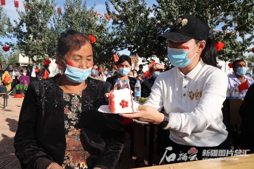 10月1日,烏什縣阿恰塔格鄉托克遜鐵提爾村,為慶祝中華人民共和國成立73周年,結對認親干部和各族群眾一起切蛋糕,歡度節日。外力·克依木 攝