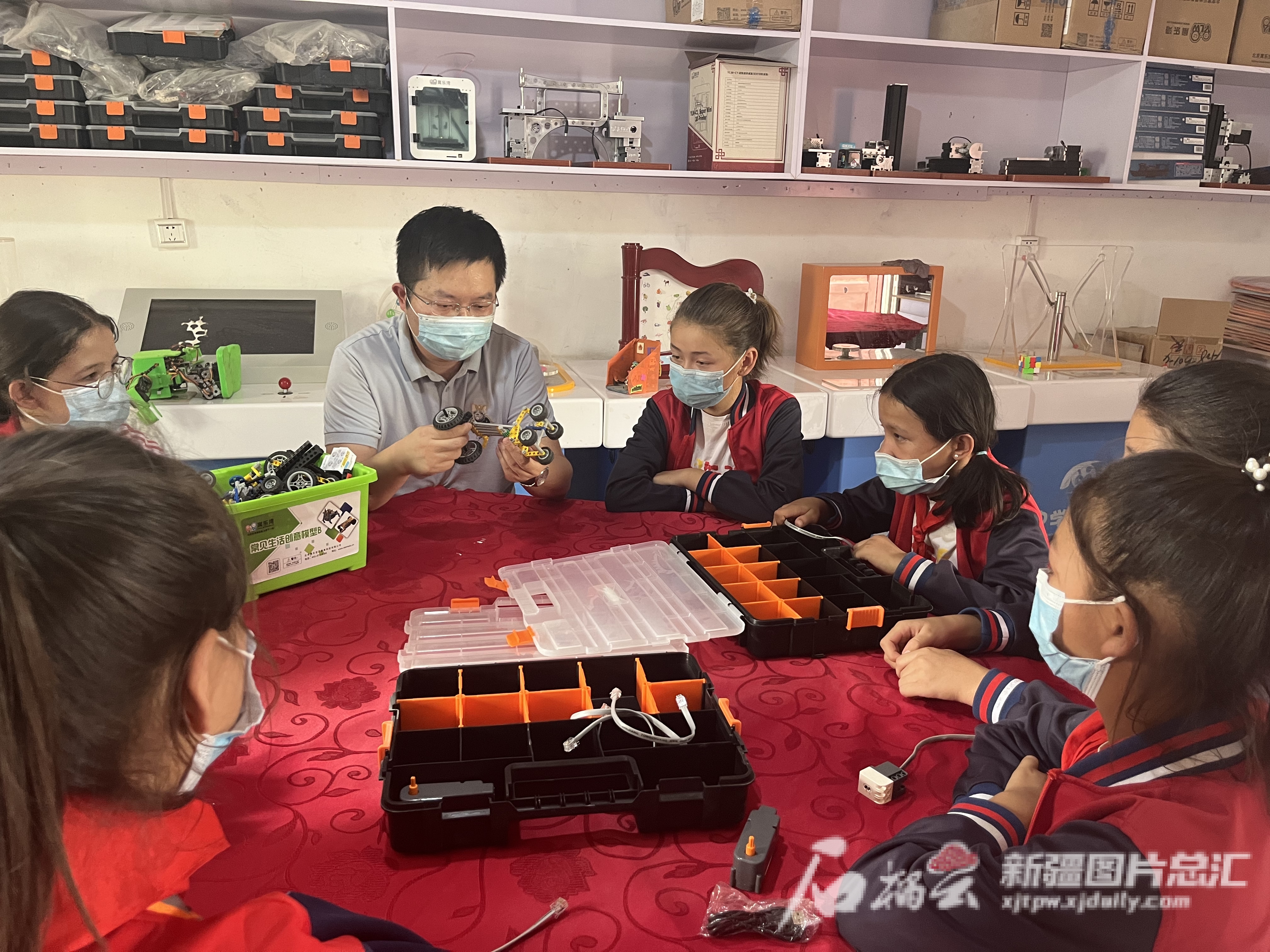 國慶假期,盛凱為民豐縣安迪爾鄉繁榮村的孩子們輔導機器人拼裝。曲聞博 攝