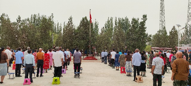 在繁榮村活動現(xiàn)場,上午9:30,全體工作隊同志與農(nóng)牧民群眾齊聚在村委會舉行“升國旗、唱國歌”儀式。鮮艷的國旗伴隨著雄壯的國歌冉冉升起,大家行注目禮,齊唱國歌,在飄揚的五星紅旗下抒發(fā)對中國共產(chǎn)黨、偉大祖國的熱愛之情。