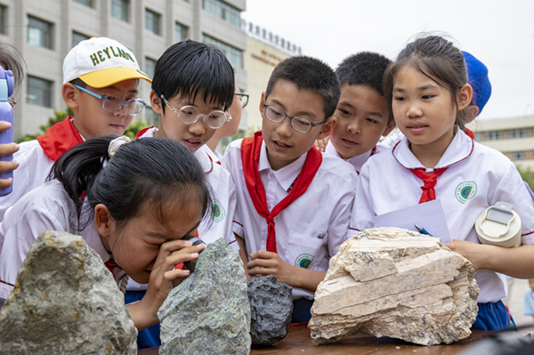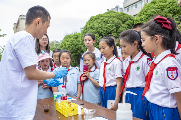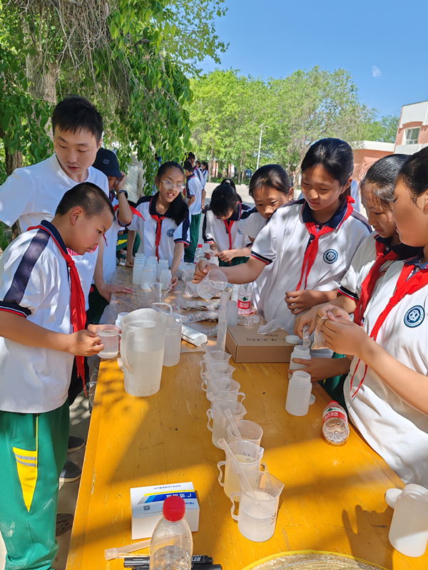 新疆土壤與肥料學會的研究生盧詩陽演示了活性炭對水中亞甲基藍的吸附性能實驗,深深吸引著烏魯木齊市第113中學八年級學生陸弈澄、赫景玄的目光,他們也一齊動手參與進來。陸弈澄說:“今天的小實驗很有趣,老師說,以后在化學課上我們也可以做實驗,我現在對化學課充滿了期待。”