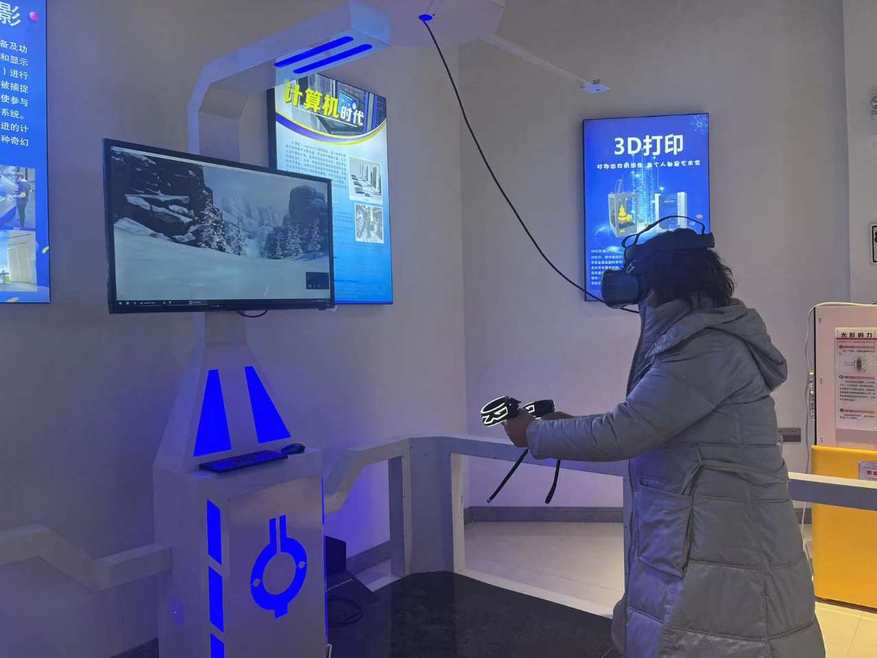 隨著北京冬奧會的舉行,位于未來之約展廳的VR體驗區(qū)滑雪項目成為館內(nèi)最大的亮點。大家頭戴VR眼鏡,沉浸在VR滑雪比賽中,或轉(zhuǎn)彎,或跳躍,或躲避障礙物,爭先體驗,不亦樂乎。