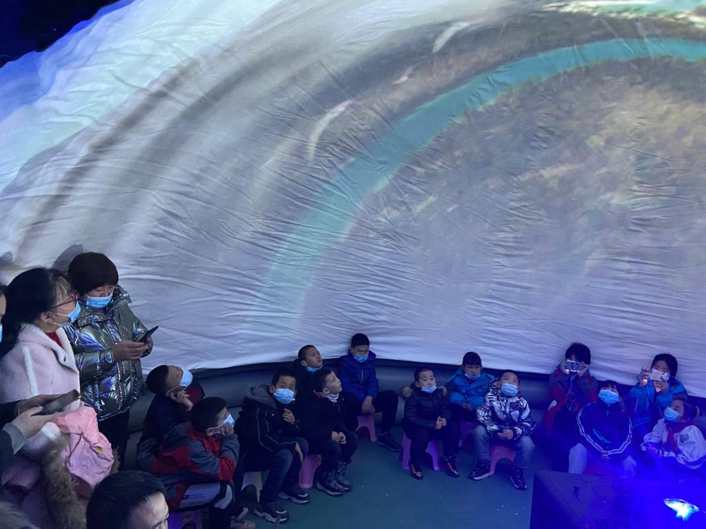 在球幕影院里,同學們借助特殊的超廣角魚眼鏡頭,觀看《恐龍誕生》相關紀錄片,立體的表現形式讓在場的家長及學生眼前一亮,仿佛身臨其境。