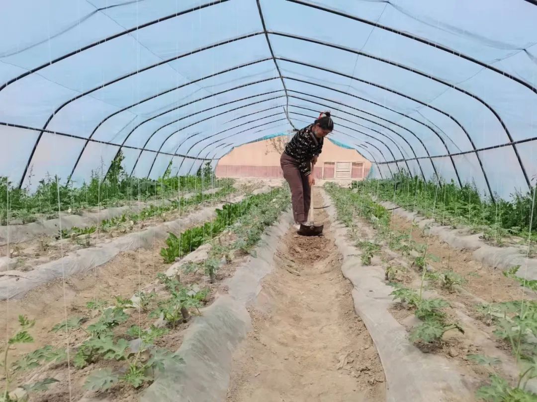走進阿拉庫姆力克(17)村2組村民帕太木·圖拉麥提家的拱棚,一片翠綠映入眼簾,拱棚內的西瓜苗正煥發(fā)著勃勃生機,帕太木·圖拉麥提正在拱棚里忙著給西瓜苗培土。