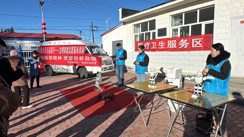 活動現場設置了多個展區,有科技產品展示區、醫療衛生服務區、圖書展區和體育項目體驗區。塔城市科技館的工作人員們在對應的展區擺列機器狗、“阿爾法”機器人、六足機器人、科學家精神展板等。
