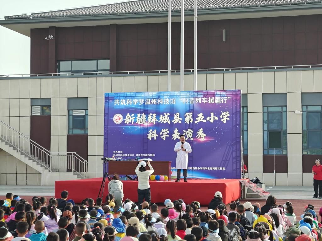 9月25-27日,由溫州市科協、溫州援疆指揮部主辦,溫州科技館和拜城縣科協承辦的溫州市“科普列車援疆行—共筑科學夢”科普系列活動,在拜城縣第六中學、第五小學和第一小學相繼展開。此次活動通過科學課程、科學表演秀、科學教師培訓等多種形式,為中小學生和教育工作者帶來了一場科學盛宴。