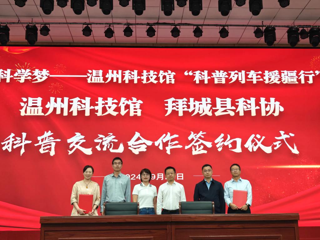 在溫州市“科普列車援疆行—共筑科學夢”啟動儀式上,溫州科技館與拜城縣科協簽署了《科普交流合作協議》,雙方就科普產品、科普服務以及科普公共資源的共建共享建立長效的合作機制。此外,啟動儀式上還舉行了科學教育資源包、科學圖書器材的捐贈儀式,捐贈方包括溫州科技館、溫州市廣場路小學等單位。同時,浙江省施昌魏小學科學名師網絡工作室與拜城縣第五小學也簽訂了結對協議,旨在進一步豐富學校的科普教學內容,助力“雙減”政策的落地實施。