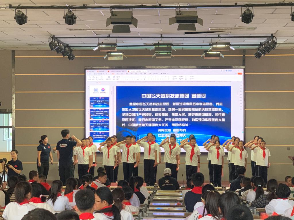 9月4日上午,活動在沙灣市第五中學(xué)學(xué)校大禮堂舉行。沙灣市科協(xié)黨組書記蔣濤、沙灣市第五中學(xué)副校長海納爾,中國運(yùn)載火箭技術(shù)研究院、長征系列運(yùn)載火箭總體工藝師研究員、中國飛天夢科技志愿團(tuán)專家志愿者王金山、中國飛天夢科技志愿團(tuán)書記、團(tuán)長李俊天、中國飛天夢科技志愿團(tuán)副團(tuán)長張海出席活動。全校師生共計(jì)300余人參加活動。